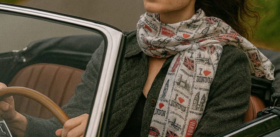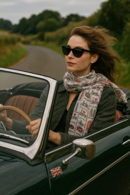 「英国車のオープンカーに乗って、このスカーフを首に巻いて
